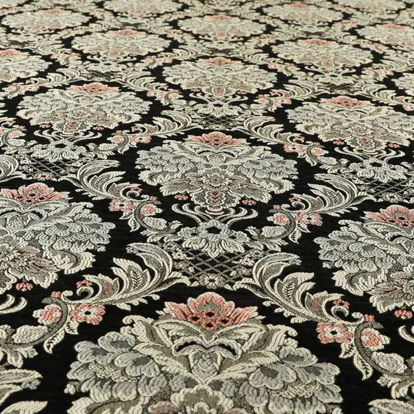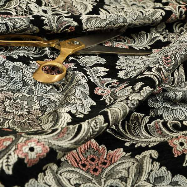 The legacy damask collection features an exotic rich floral pattern in elegant black, grey, and pink. This upholstery fabric is ideal for Roman blinds, adding a touch of sophistication to any space. Made with high-quality materials, it offers durability and style in one. Upgrade your home decor with this luxurious collection.