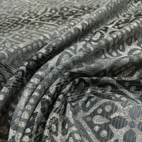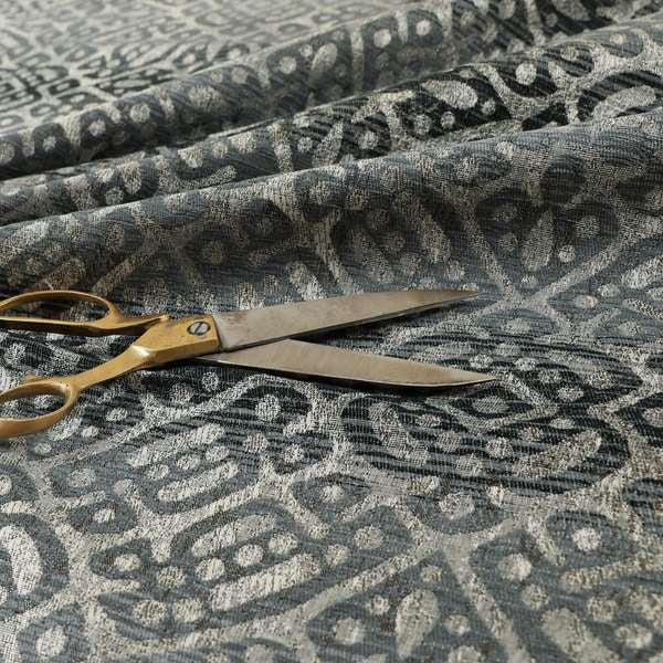 Upgrade your home decor with Lomasi Roman blinds. With a sleek gun metal grey colour and intricate Portuguese medallion pattern, these designer blinds offer a touch of elegance to any room. The metallic tones add a touch of glamour and the fabric ensures privacy and light control. Available in various sizes.