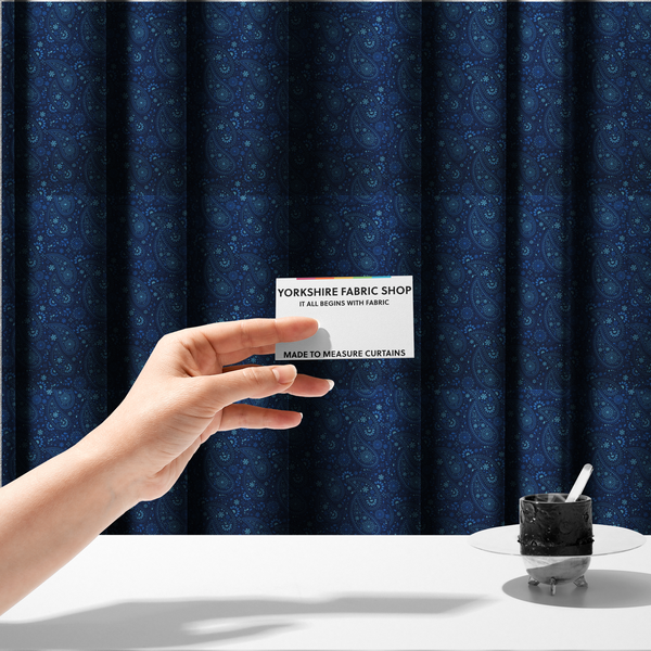 Elevate your interior with this sophisticated midnight navy paisley upholstery fabric DP-100, expertly crafted for bespoke curtain solutions. The rich navy base provides a timeless backdrop, while the intricate paisley pattern adds refined visual interest to any room. This premium upholstery-weight fabric offers exceptional durability and drape, making it ideal for made-to-measure curtains that demand both elegance and performance. Perfect for creating statement window treatments that complement traditional and contemporary décor alike. Order your custom length today and transform your space with professional-quality fabric tailored to your exact specifications.