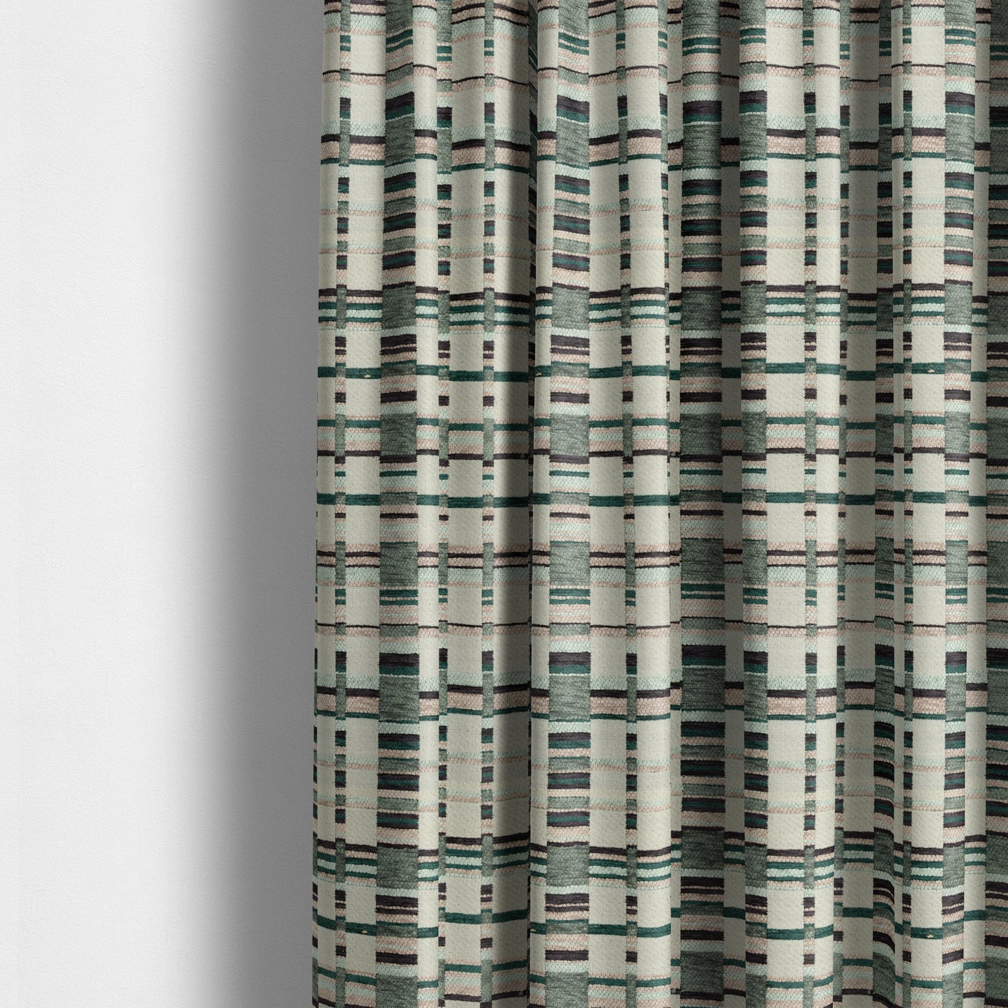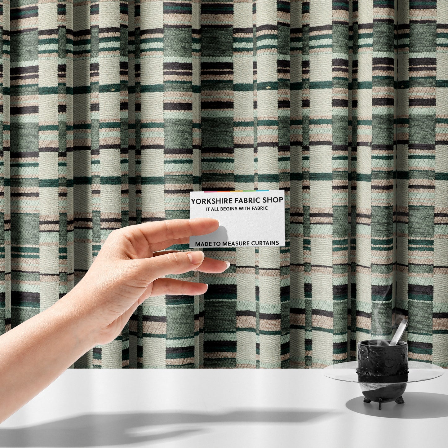 This modern geometric striped block pattern upholstery fabric boasts a striking color palette in calming blue tones. Made from luxurious chenille, it's perfect for custom curtains to add a touch of contemporary style to any space. Available in made-to-measure sizes for a perfect fit every time.