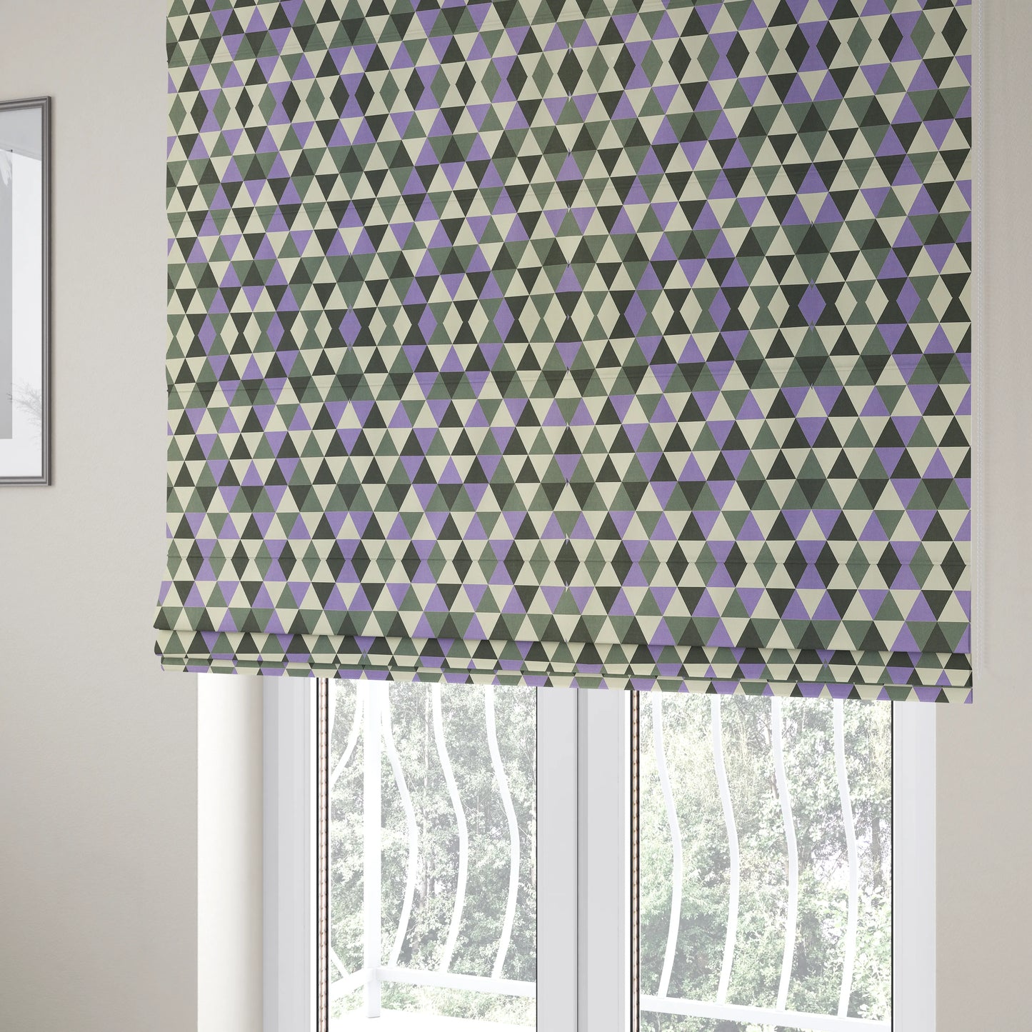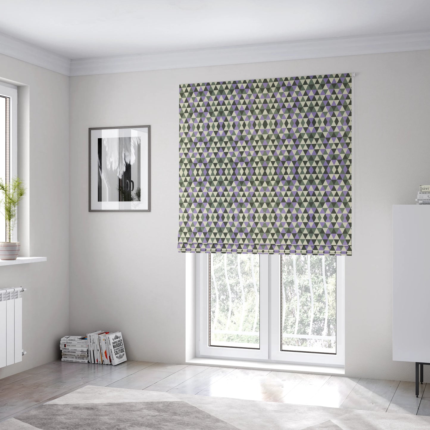 Elevate your room's style with our Monica purple grey white black Roman blinds. The soft, chenille designer fabric boasts a geometric pattern that adds a touch of sophistication to any space. Enjoy a perfect balance of privacy and natural light with these statement-making window treatments.