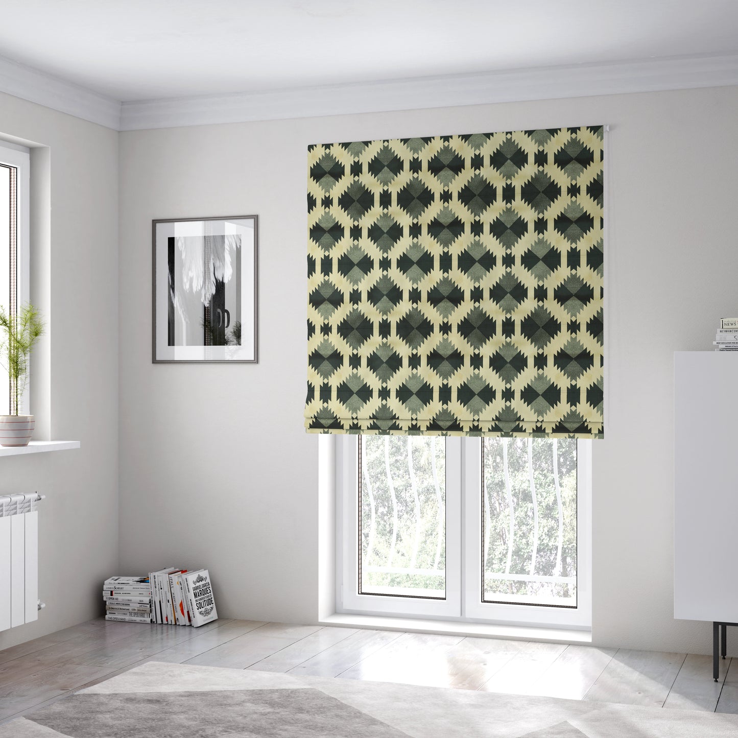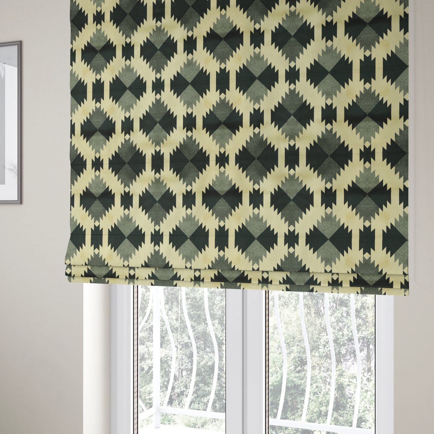 Elevate your interior design with our Navy blue cream colour kilim aztec pattern velvet woven upholstery fabric jo-1025. With a unique kilim aztec pattern in a classic navy and cream colour, this fabric adds a touch of elegance to any room. Perfect for Roman blinds, experience the softness and durability of our velvet woven fabric.