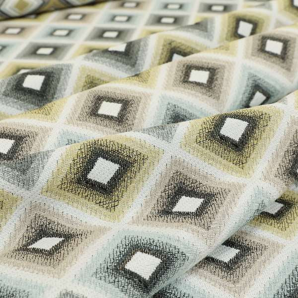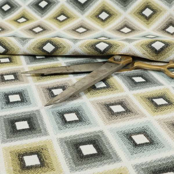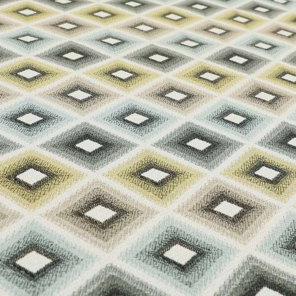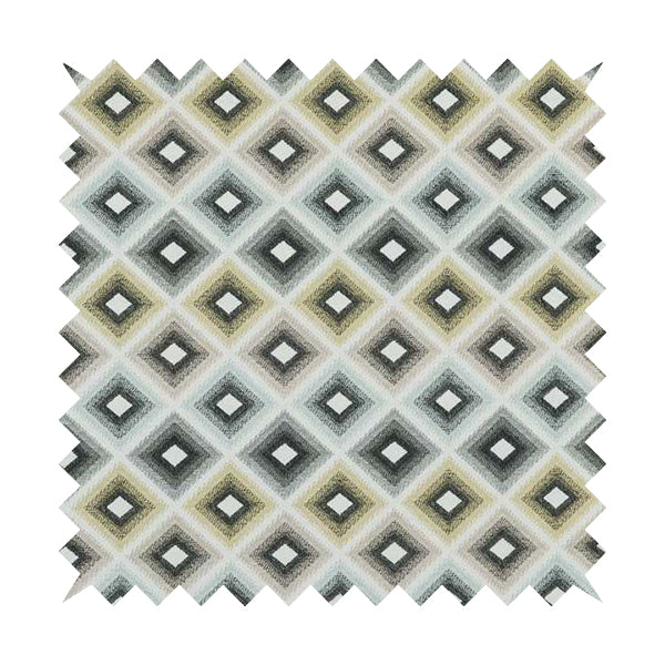 This Normandie fabric features a geometric pattern in yellow and grey, adding a stylish touch to any space. Made with jacquard upholstery, it is perfect for durable and high-quality Roman blinds. Elevate your home decor with this expertly crafted fabric.