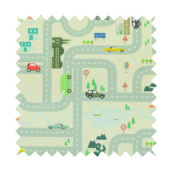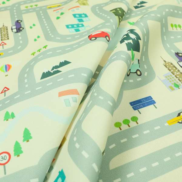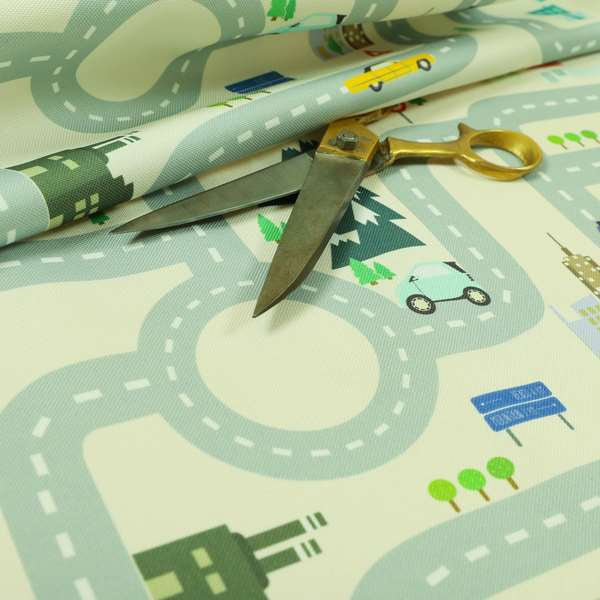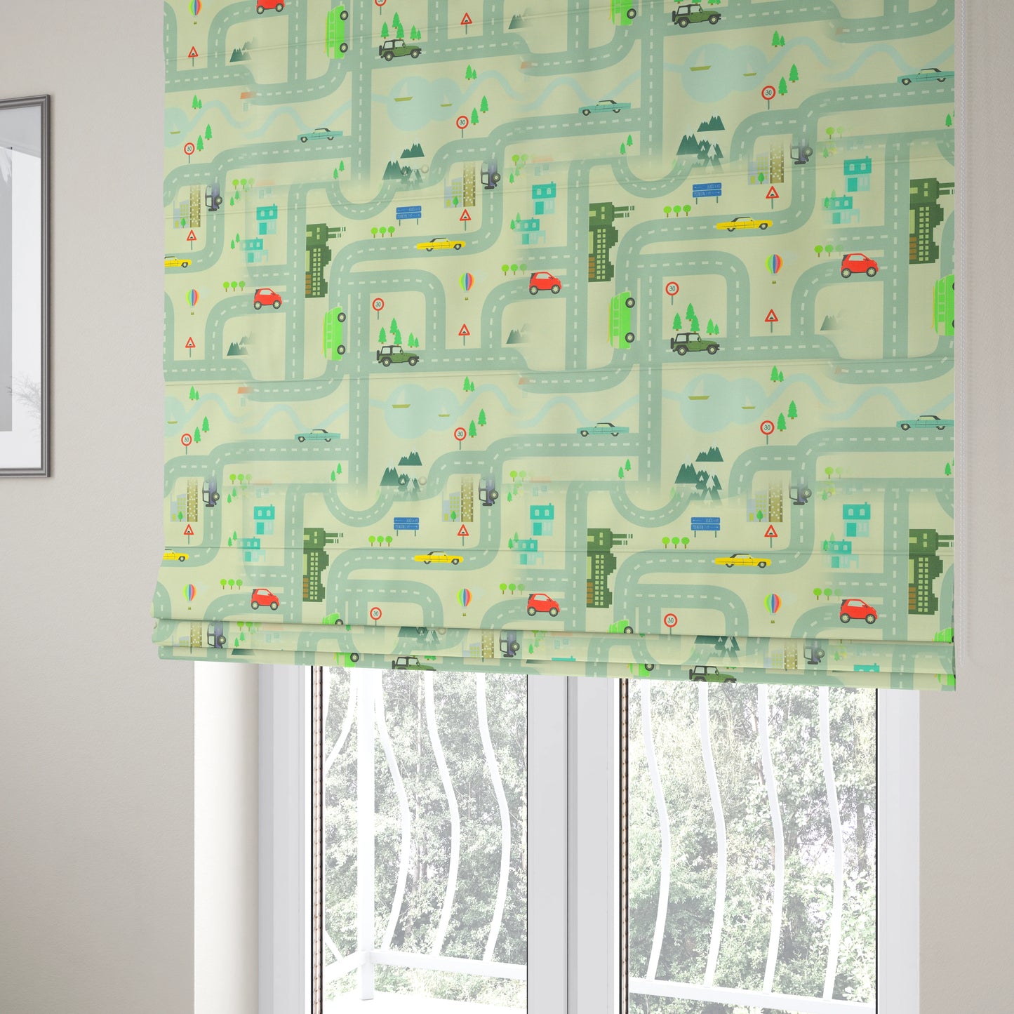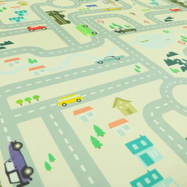 This children's play mat features a road map and car pattern, perfect for imaginative play and enhancing motor skills. The upholstery fabric is printed in white, providing a modern and sleek look. Roman blinds offer adjustable light control and privacy. A functional and stylish addition to any child's room.