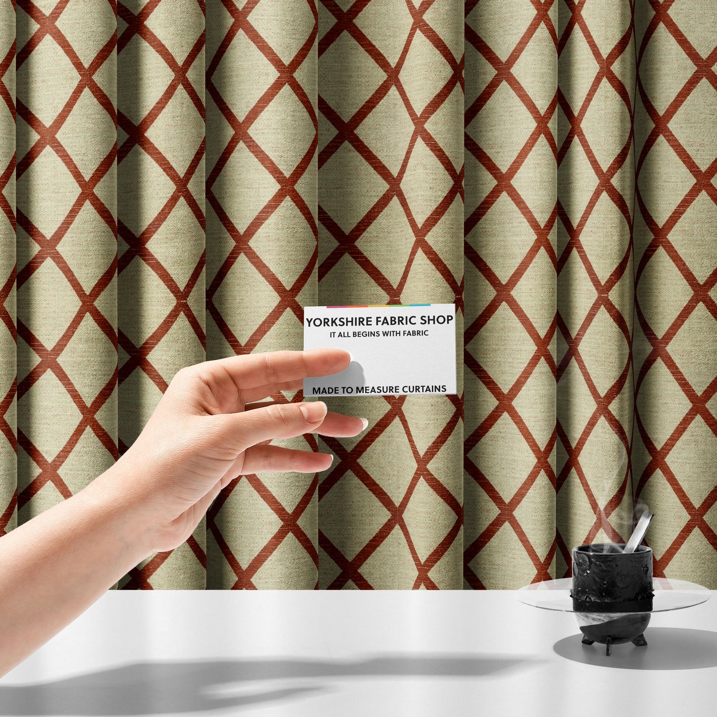 Enhance your home with our made-to-measure Orange cream geometric pattern soft chenille furnishing fabric. Durable and luxurious, this fabric is designed with a classic orange and cream geometric pattern that adds a touch of sophistication to any room. Elevate your interior design and enjoy the benefits of this high-quality, custom-made curtain fabric.