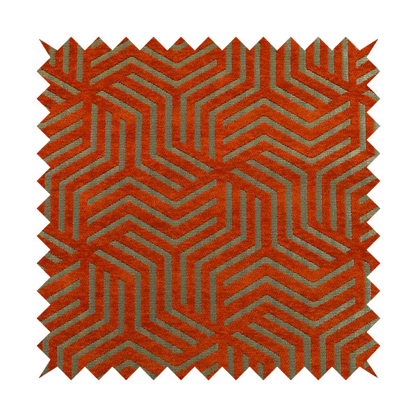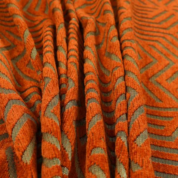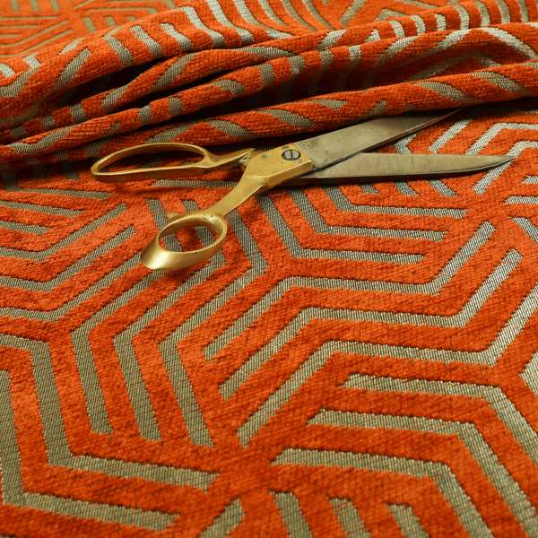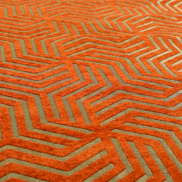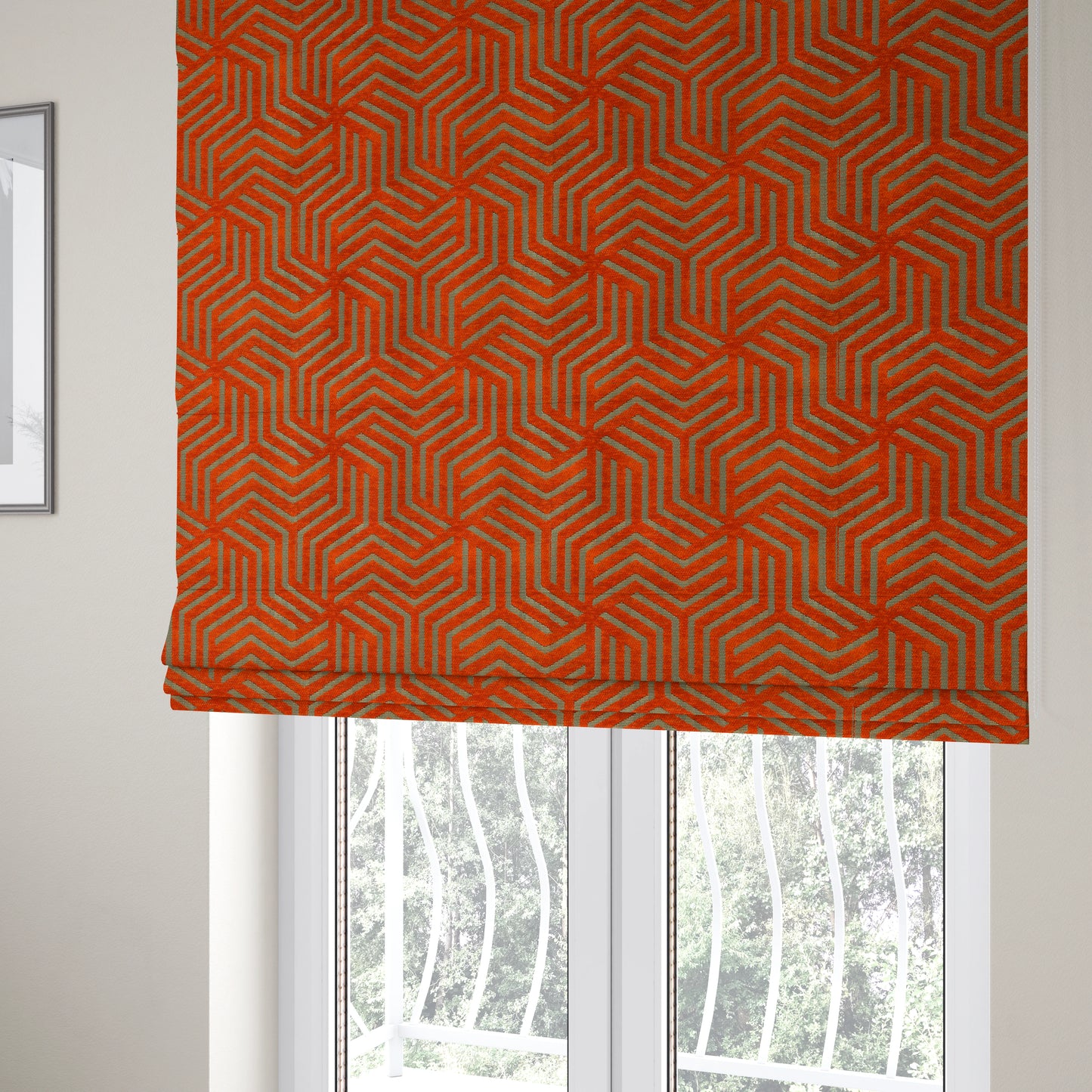This chenille upholstery fabric features a unique geometric pattern in a vibrant orange and gold colour, adding a touch of sophistication to any room. The soft and shiny fabric is perfect for creating stylish Roman blinds that will enhance the decor of your home.