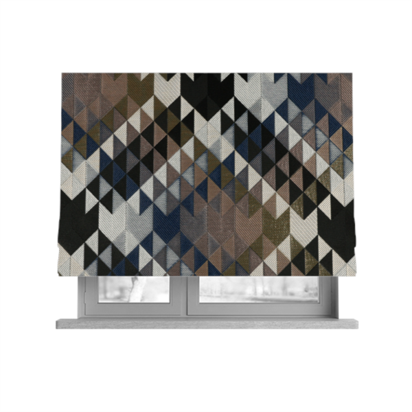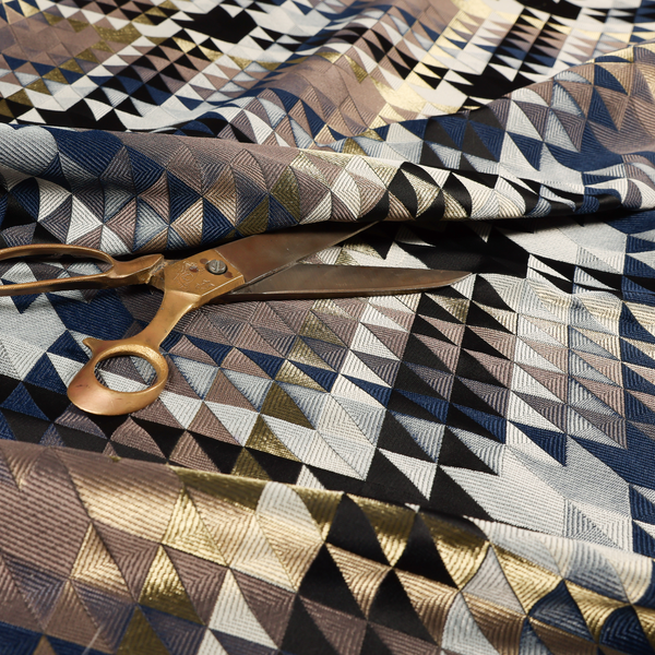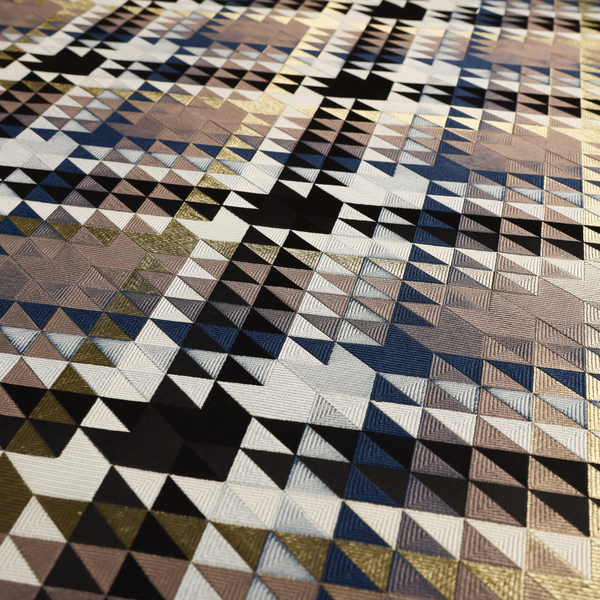 Expertly crafted, the Oslo geometric pattern fabric is perfect for adding a touch of sophistication to any room. With its unique blend of blue, gold, and black tones, this fabric is not only aesthetically pleasing, but also durable and versatile. Transform your space with this stunning fabric.