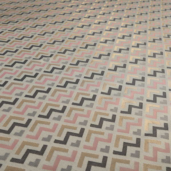 Elevate your home decor with the Oslo geometric pattern fabric. Featuring a stylish combination of grey, pink, and gold tones, this upholstery fabric adds a modern touch to any space. The durable material is perfect for creating sleek and stylish Roman blinds.