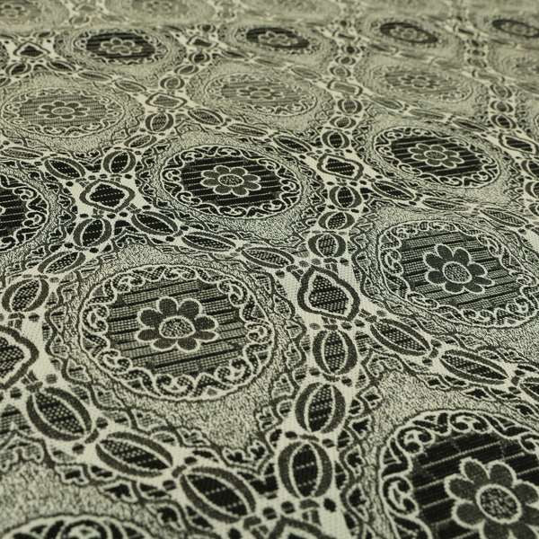 Elevate your interior design with the Palmer textured glitter upholstery furnishing pattern fabric damask circle. This fabric boasts a stunning silver, black, and grey colour scheme, adding a touch of elegance to any space. Its unique textured glitter design adds depth and dimension, making it a perfect choice for Roman blinds.