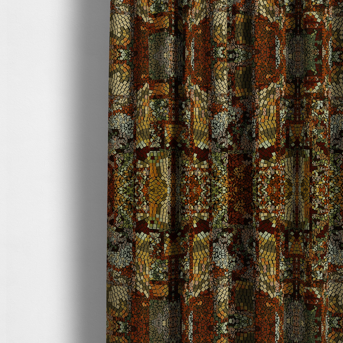 Elevate your home decor with our Pasha upholstery fabric. Featuring a stained mosaic pattern in vibrant red, yellow, and bronze hues, this chenille fabric is perfect for creating custom curtains. Add a touch of elegance and sophistication to any room with our made-to-measure curtains, tailored to perfection.