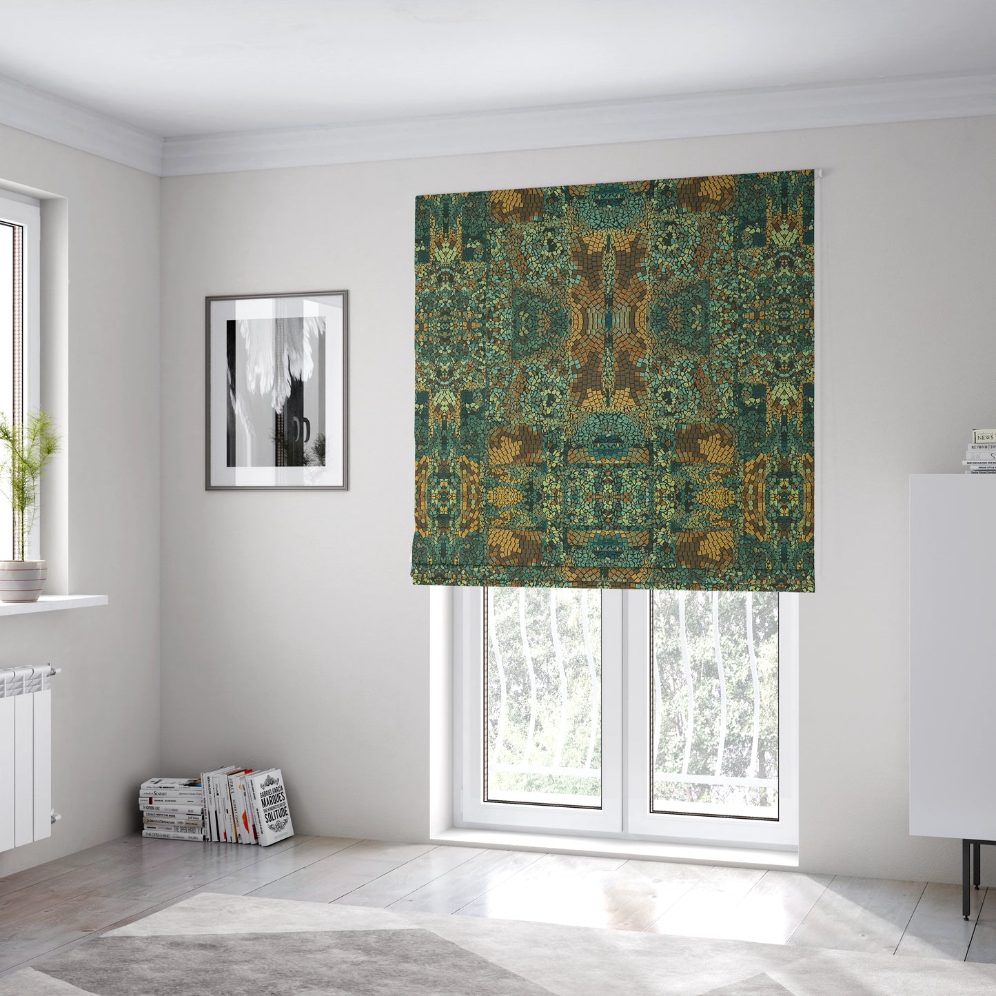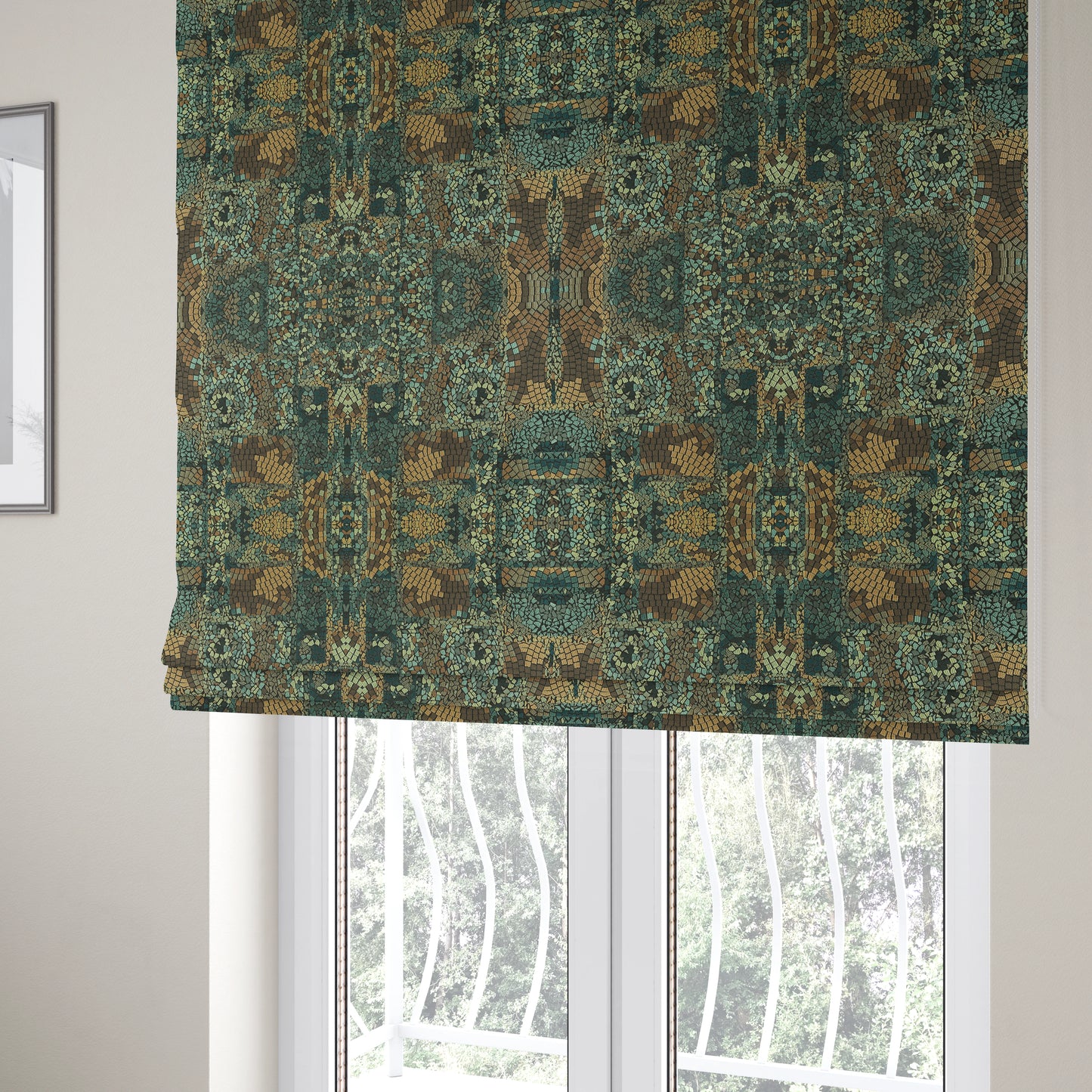 Expertly crafted Pasha stained mosaic pattern multicolour teal blue brown chenille fabric for Roman blinds. Made with high-quality materials and precision, this fabric adds a touch of sophistication to any room. With a unique stain-resistant finish, it's both stylish and practical. Elevate your space with this luxurious furnishing fabric.