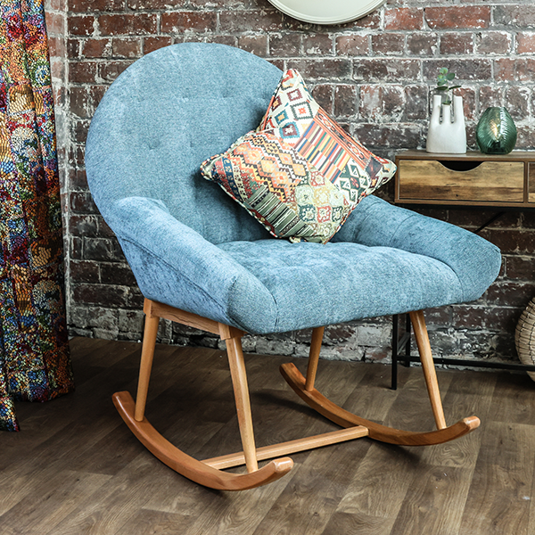 The laid-back shape of our Piero is a contemporary look that’s full of charm. It’s the perfect statement chair for those drawn to effortless, understated style. A stylish, modern design combined with extreme comfort makes it the perfect chair to sit and relax on. Featuring a soothing rocking motion, feature stitched backrest upholstered in a calming shade of mid blue textured fabric with natural wood rocking frame this armchair is equally luxurious and good looking. A contemporary choice that will enhance all interior schemes.
