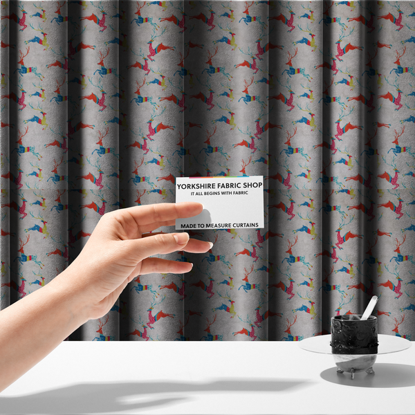 Bring festive cheer into your home with this delightful reindeer galloping furnishing fabric! Featuring prancing reindeer in vibrant multicolours, DP-25 is perfect for creating bespoke made-to-measure curtains that spark joy. This quality fabric combines durability with whimsical design, ideal for adding personality to any room. Whether you're decorating for the season or simply love the cheerful pattern year-round, these custom curtains let you choose the perfect fit and style for your windows. Transform your space with a touch of playful elegance.