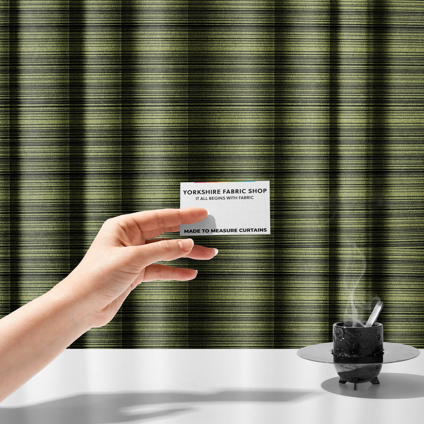 Enhance your home decor with our exclusive Samantha black striped design printed soft chenille furnishing fabric in a beautiful green colour. Made to measure for a custom fit, these curtains will add a touch of elegance and sophistication to any room. Experience the luxury and comfort of chenille in your home today.