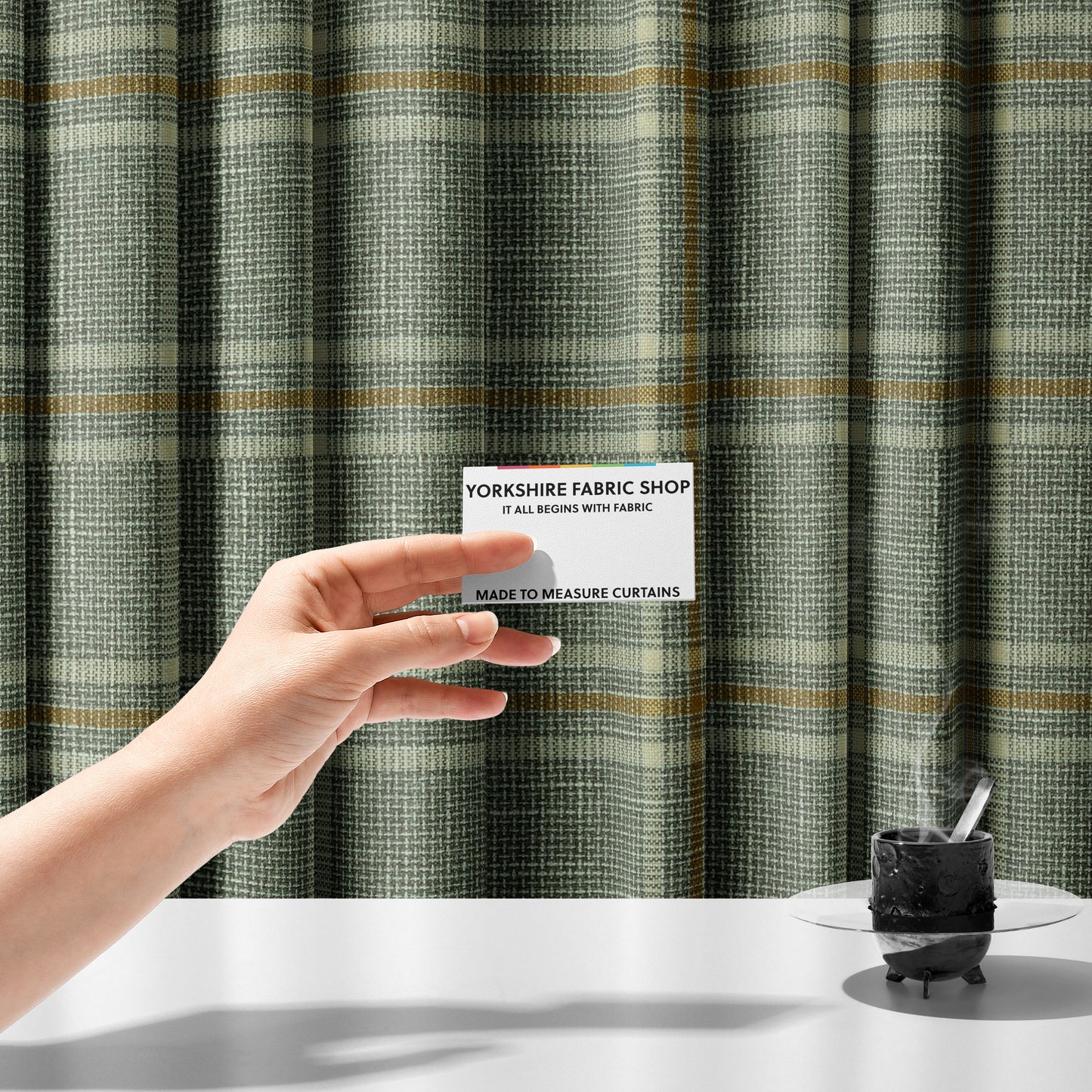 Introducing our Shaldon woven tartan pattern upholstery fabric, featuring a striking grey background with pops of vibrant yellow. Made to measure curtains provide custom fit and tailoring. Upgrade your home decor with this high-quality fabric.