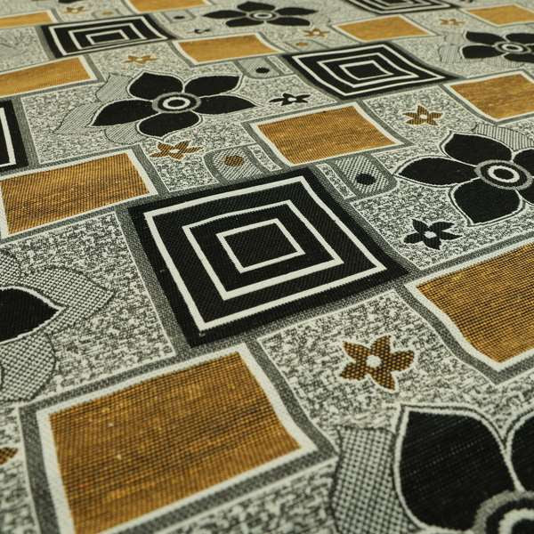 Expertly crafted with a modern design, Sitka's ctr-602 fabric features a striking floral patchwork pattern in yellow and black. This upholstery furnishing fabric adds a touch of elegance to any space, perfect for creating stylish Roman blinds that will elevate the look of any room.