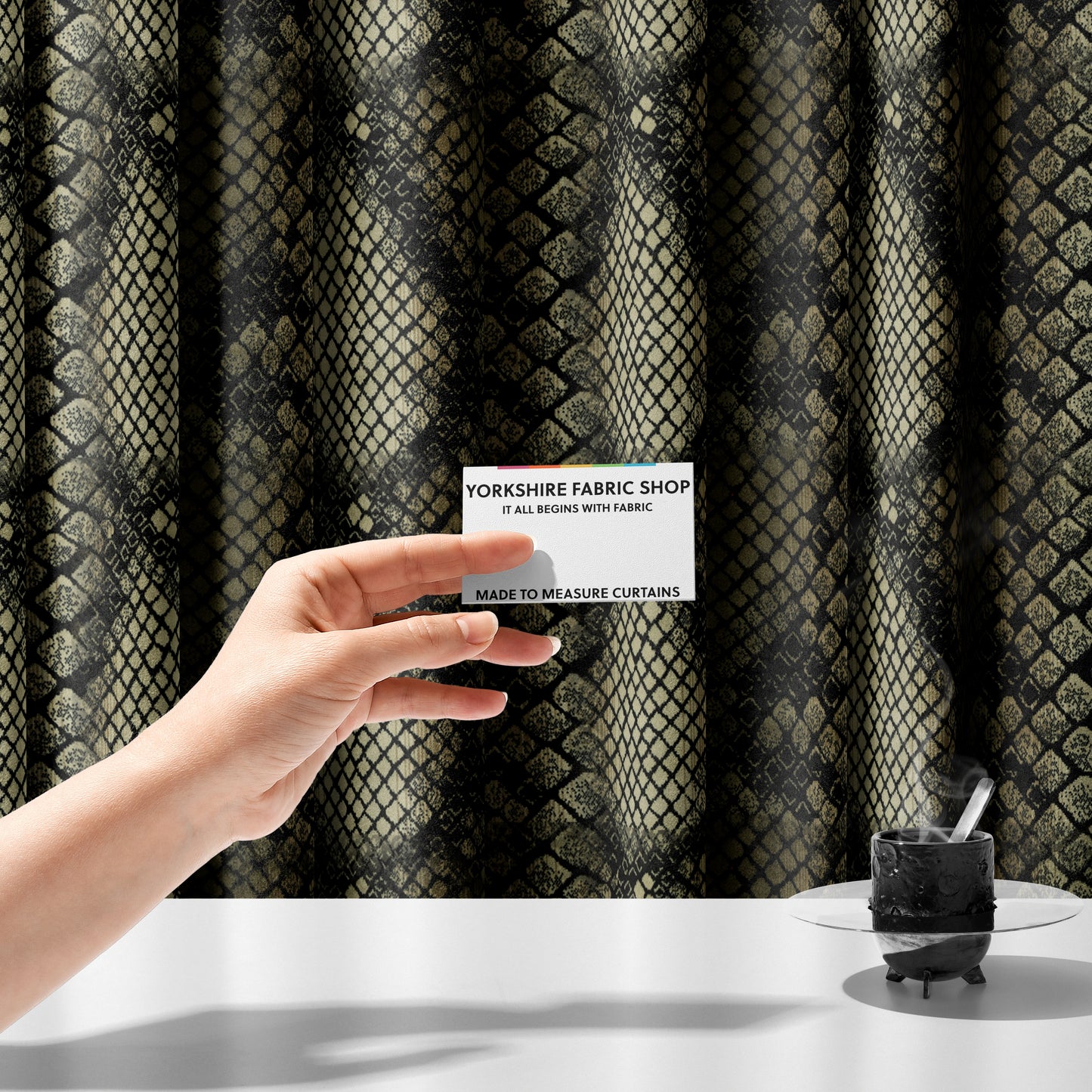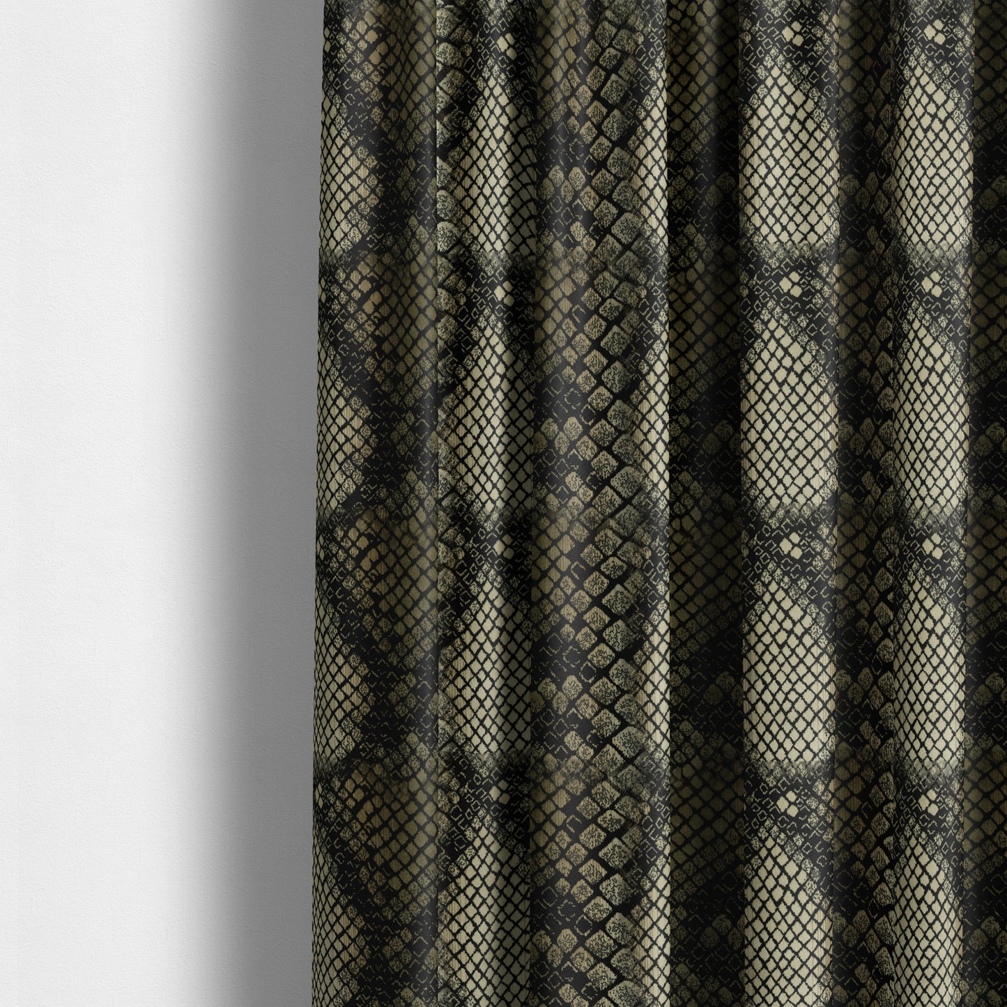 Experience luxury and elegance with our Snake scales pattern in black gold colour velvet material furnishing upholstery fabric. The unique snake scales pattern adds a touch of sophistication to any room. Made to measure curtains provide a perfect fit for your windows, creating a seamless and polished look. Elevate your home decor with this high-quality fabric.