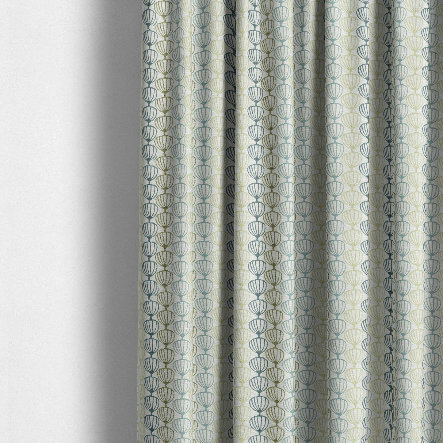 This chenille upholstery fabric features a unique teal blue green geometric balloon pattern. The soft fabric is perfect for creating made-to-measure curtains that will add a touch of elegance to any space. Transform your home with this high-quality, custom-made fabric.