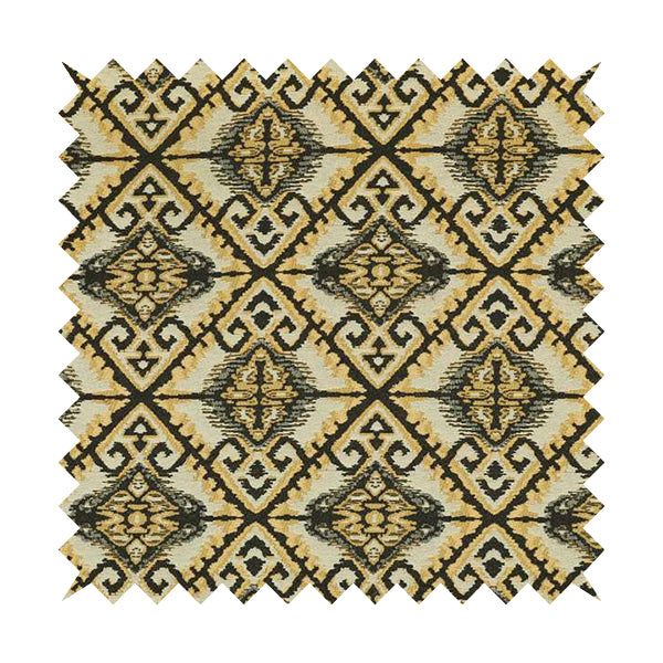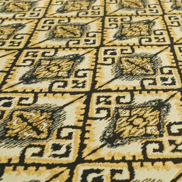 This trapeze style fabric features a unique Mexican kilim pattern in blue and yellow. Made of durable chenille, this upholstery fabric is perfect for Roman blinds, adding a touch of colour and character to any space. Transform your home with this eye-catching fabric.