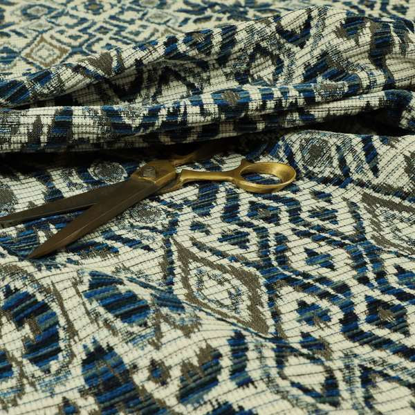 Update your home decor with our Tribal ikat Inspired pattern upholstery fabric. Made from soft chenille material, this white, brown, and blue fabric is perfect for Roman blinds. Bring a touch of tribal design and comfort to any room.
