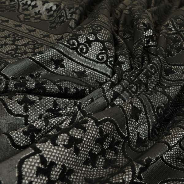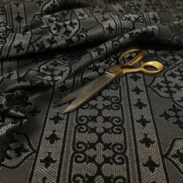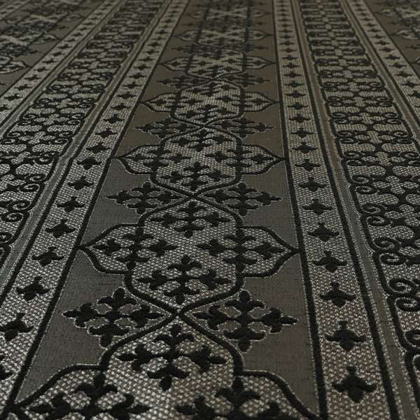 This Vegas black silver shine effect striped medallion pattern soft chenille upholstery fabric is perfect for creating stunning, sophisticated Roman blinds. With a bold and modern design, it is sure to add a touch of luxury and elegance to any living space. Transform your home with this high-quality, versatile fabric.