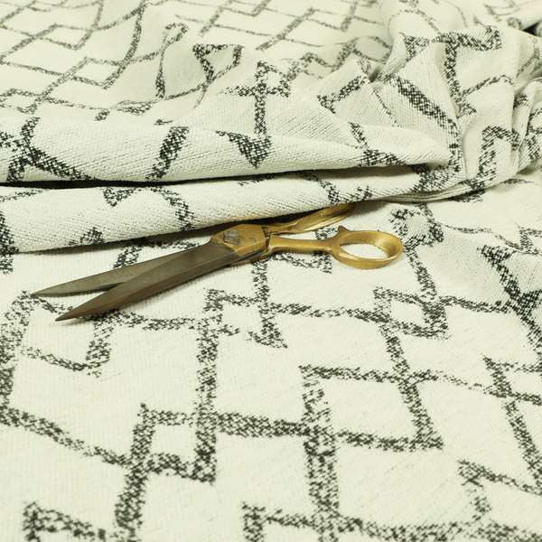 This white and black chenille upholstery fabric features a striking geometric pattern, perfect for adding a modern touch to your space. The fabric is durable and ideal for creating Roman blinds that will effortlessly elevate any room. Make a statement with this unique and stylish fabric.