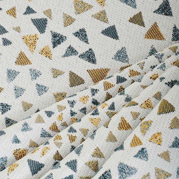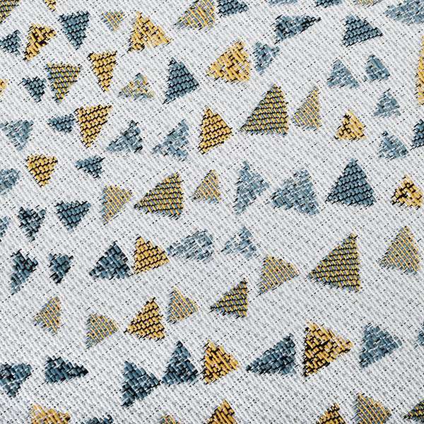 This handmade chenille fabric is a perfect addition to any home decor with its geometric pyramid shape and soft texture. Its White, yellow, and blue colours provide a bright and modern touch to any space. Upholster your cushions in this fabric for a unique and comfortable look.