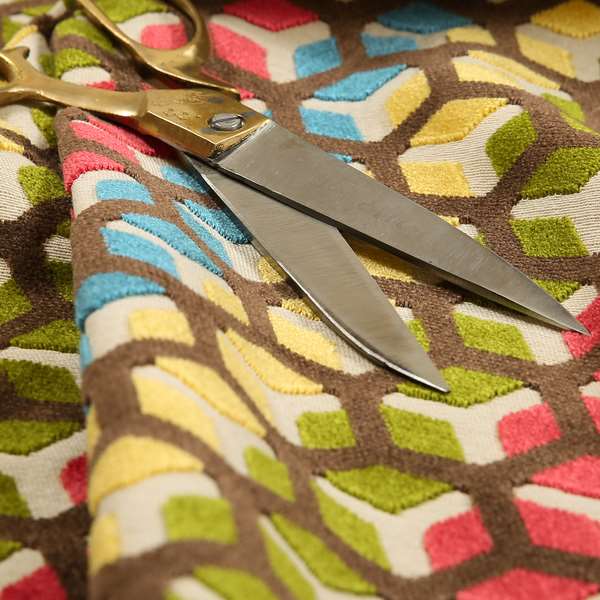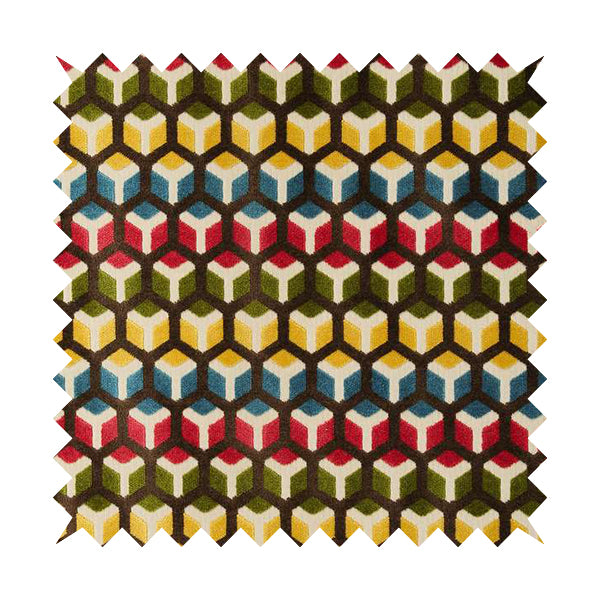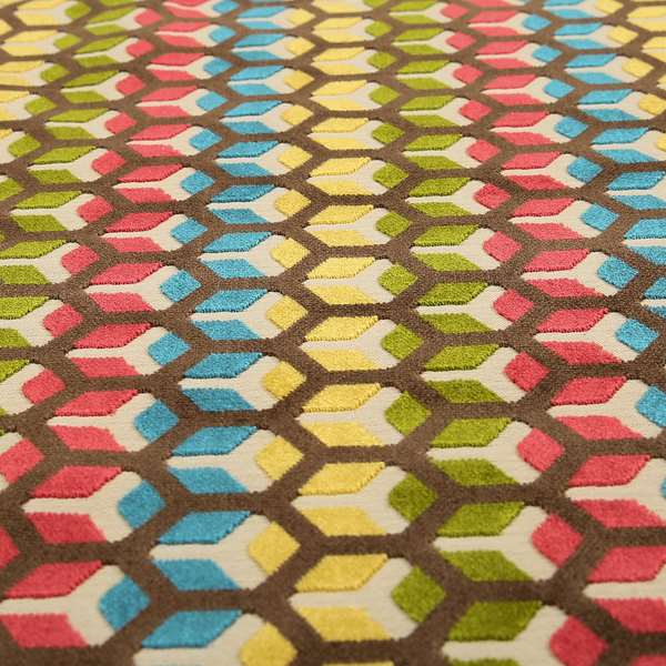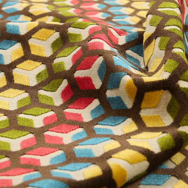 Elevate your home's interior with our Ziani geometric hexagon pattern in vibrant green, pink, yellow, and brown. Made of soft, luxurious velvet, our upholstery fabric adds a touch of elegance and warmth to any room. Perfect for Roman blinds, for a stylish and functional window treatment.