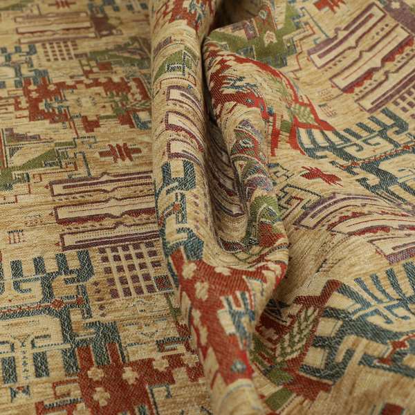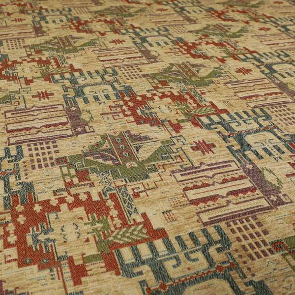 Enhance your home with our Zoque kilim Roman blinds. Made from chenille fabric, featuring a vibrant tribal patchwork pattern, these blinds add a touch of bohemian charm to any room. The intricate details and warm beige colour create a cozy and inviting atmosphere.