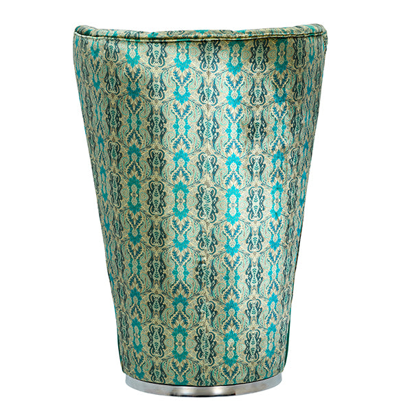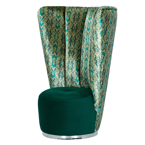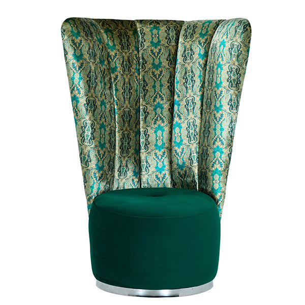 Time to be bold - Tall, refined and exuding design flair our Zuria chair always makes a statement. Finished in a mix of sumptuous stunning velvets it's colour palette is very on trend combining plain forest green with a contrasting patterned abstract velvet in a green, gold and aqua mix. The seat is deeply cushioned for comfort with a central feature button, the fluted back wraps around offering both comfort and support, all beautifully finished with complimentary piping. The seat base is supported by a brushed stainless silver finish plinth to match interiors. The Zuria is for those corners that need a little love or as a stand alone talking piece in a worthy hallway, however you intend to display it you won't be disappointed.